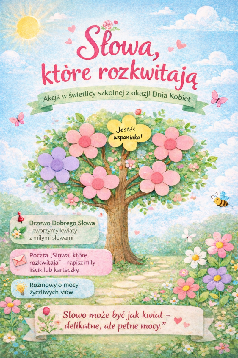 W świetlicy szkolnej z okazji Dnia Kobiet odbyła się wyjątkowa akcja w ramach programu Szkoła Dobrego Słowa pod hasłem „Słowa, które rozkwitają”.